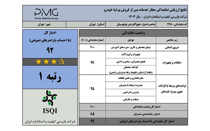 رتبه نخست نمایندگی پرشیا خودرو هویک در زمینه خدمات از شرکت بازرسی کیفیت و استاندارد ایران در سال ۱۴۰۳