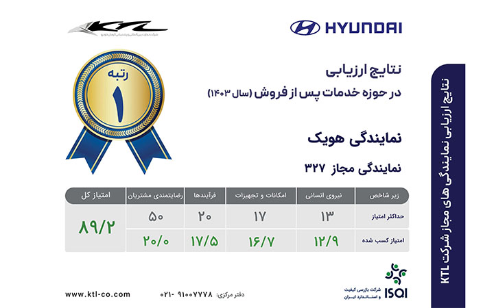 رتبه نخست نمایندگی هیوندای کرمان موتور هویک (شعبه غرب) در زمینه خدمات از شرکت بازرسی کیفیت و استاندارد ایران در سال ۱۴۰۳